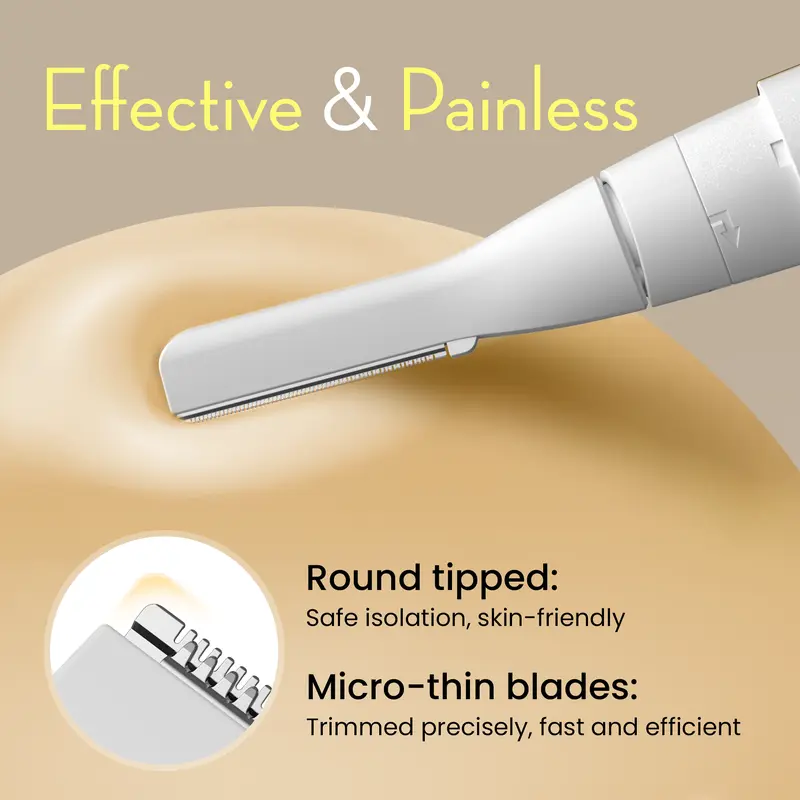 ·Gentle & Effective: This body hair trimmer adopts R-type ultra thin blades, which fits the skin and removes hair accurately. Equipped with hypoallergenic stainless steel blades and rounded tips, it safely removes fine hairs without irritation, making it ideal for daily use on all skin types·Smooth Swing Trimmer Head: The facial hair trimmer uses a flexible swing trimmer head, effortlessly trace your body natural contours for more comfortable convenient head to toes trimming·Multi-functional: Perfect for eyebrows, bikini lines, sideburns, peach fuzz, & facial hair, great for any area needing light hair removal. Providing long-lasting value and adaptability to different beauty needs·Easy to Clean: After using, if there is dirt on the removable head, you can easily detach the component clean in seconds under running water. And equipped with 2 pcs replaceable blades to ensure long-term use·Hair Removal On-the-Go: This body hair trimmer has been designed with a sleek pen shape, stylish profile to fit comfortably in either hand and slip easily into the beauty kit or bag for trimming anytime adding a finishing touch