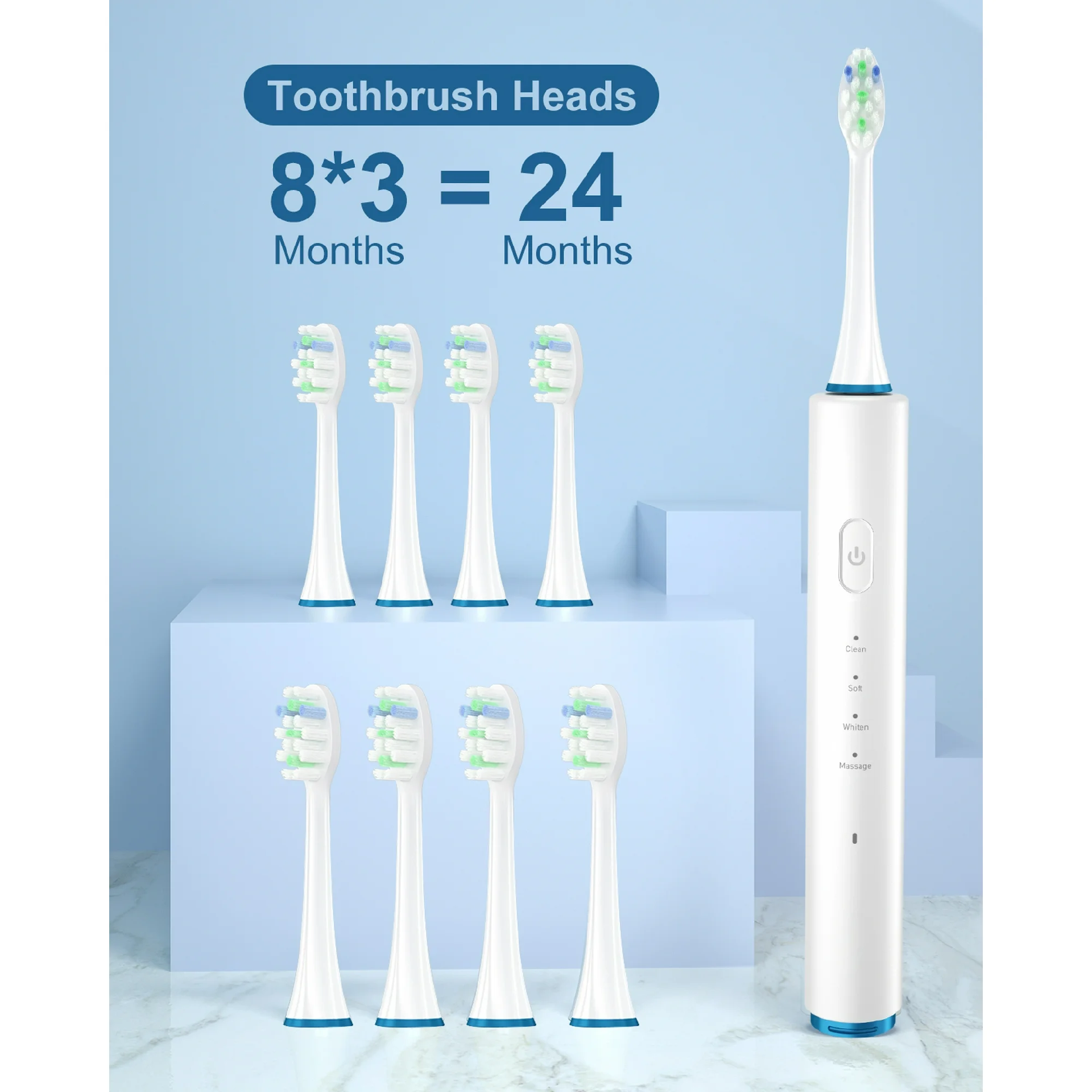 8 Brush Heads Up to 24 Months Use:Includes 8 replacement brush heads, each lasting 3 months, providing up to 24 months of use,Long-lasting value with soft bristles designed for adults, kids, and sensitive teeth, making it a family-friendly electric toothbrush.